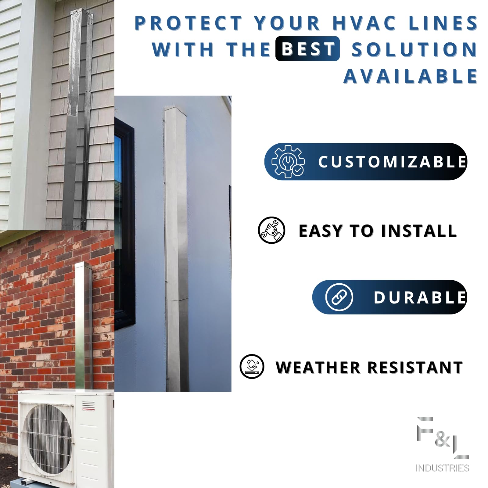 F&L Heavy-Duty Raw Galvanized Metal Line Cover Set for AC & Heat Pump – Unpainted (5"x5"x48" to 96") and Shipped in Two Pieces.